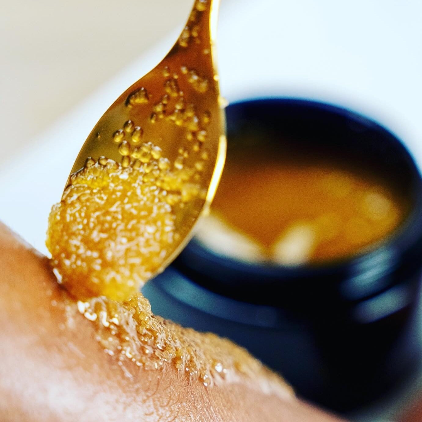 Sugar, Organic Cold Pressed Coconut oil, Prunus Amygdalus Dulcis oil (Sweet Almond oil), Persea Gratissima (Avocado oil), Tocopherol (Vitamin E oil), Citrus Sinensis (Sweet Orange), Zingiber officinale (Ginger). Patch test recommended before use.